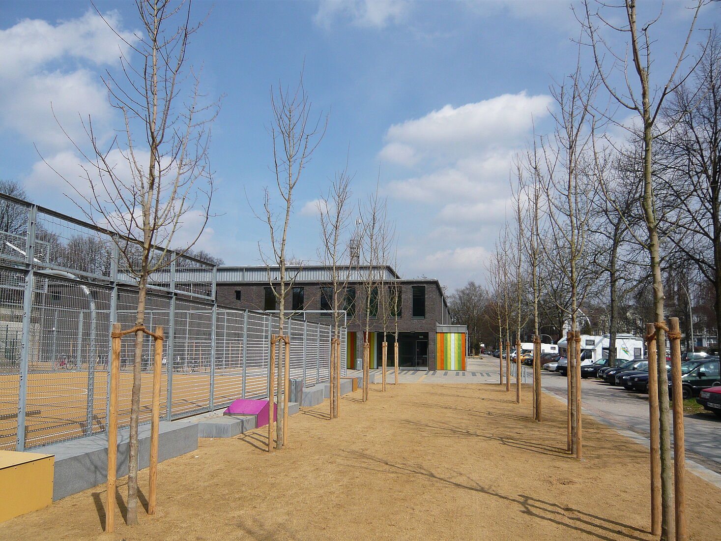 Las diferentes áreas funcionales se distribuyen en varios niveles alrededor de una zona central del pabellón. En la planta superior hay una galería que puede utilizarse para otras actividades deportivas o como tribuna. Los colores claros y alegres y la iluminación natural dominan el aspecto del pabellón. La colorida fachada de cristal crea un interesante juego de luces entre el interior y el exterior. Los numerosos nichos para sentarse hacen que el pasillo sea muy agradable.
