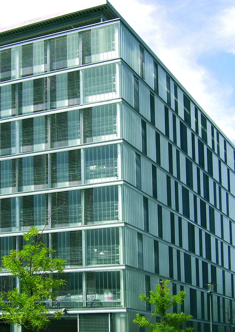La facciata dell'edificio cubico è rivestita con LAMBERTS LINIT®EcoGlass, un vetro ecologico prodotto in modo sostenibile, la cui superficie traslucida lascia intravedere solo le strutture dei veicoli parcheggiati dietro. È interrotta a intervalli irregolari da griglie a griglia alte quanto il soffitto, che conferiscono al parcheggio multipiano un aspetto tecnico.