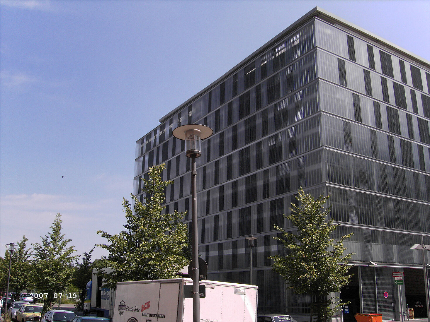 La facciata dell'edificio cubico è rivestita con vetro profilato. La sua superficie traslucida lascia intravedere solo i contorni dei veicoli parcheggiati all'interno. A intervalli irregolari, la facciata è interrotta da griglie a griglia alte quanto il soffitto, che conferiscono al parcheggio multipiano un aspetto tecnico.