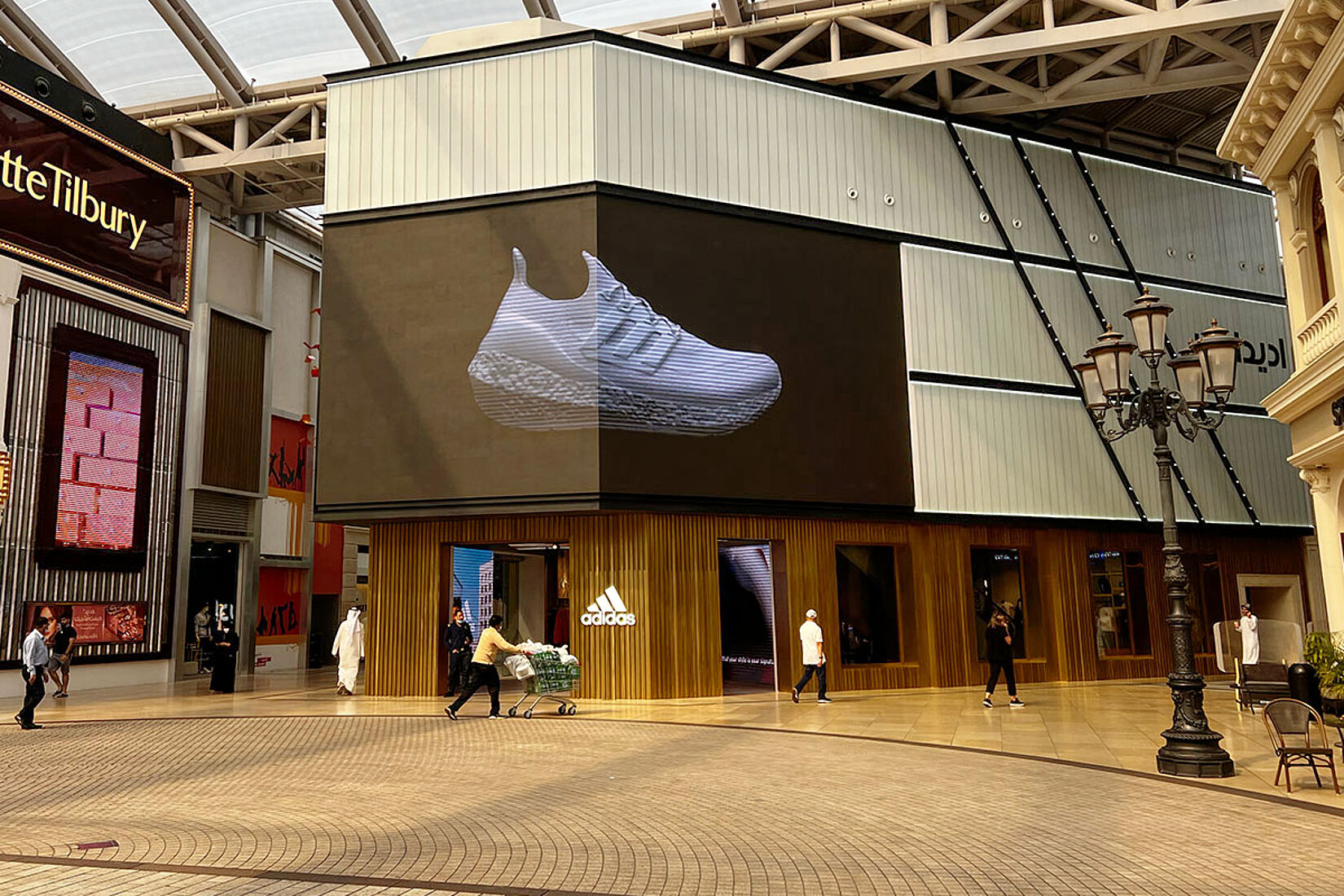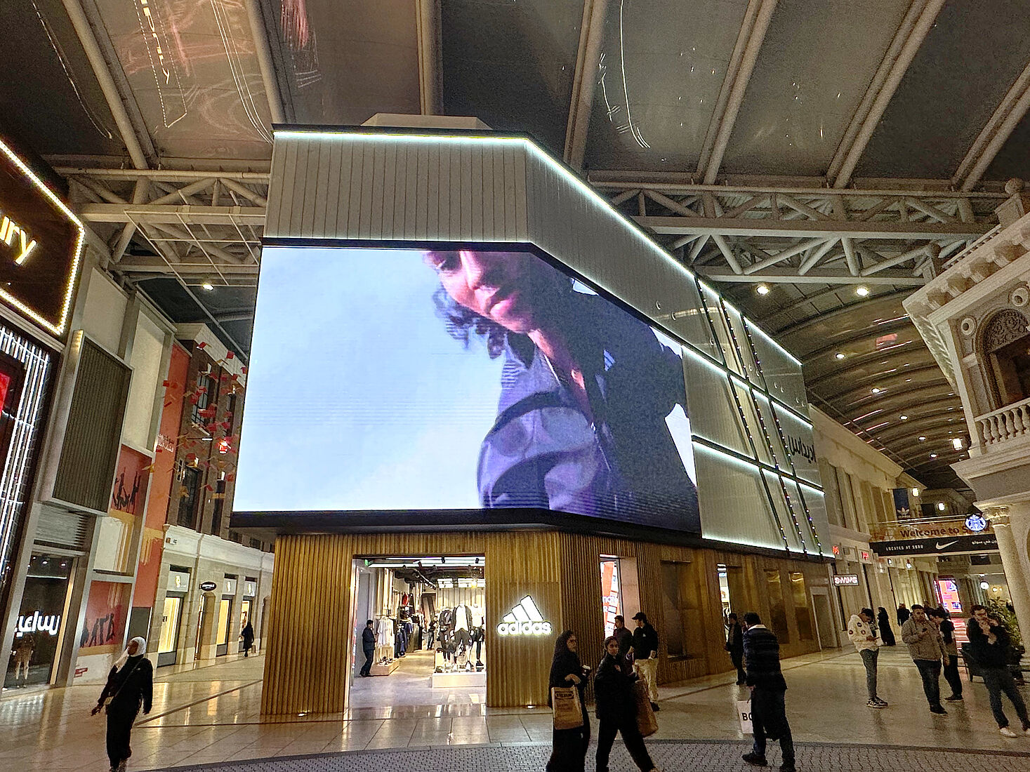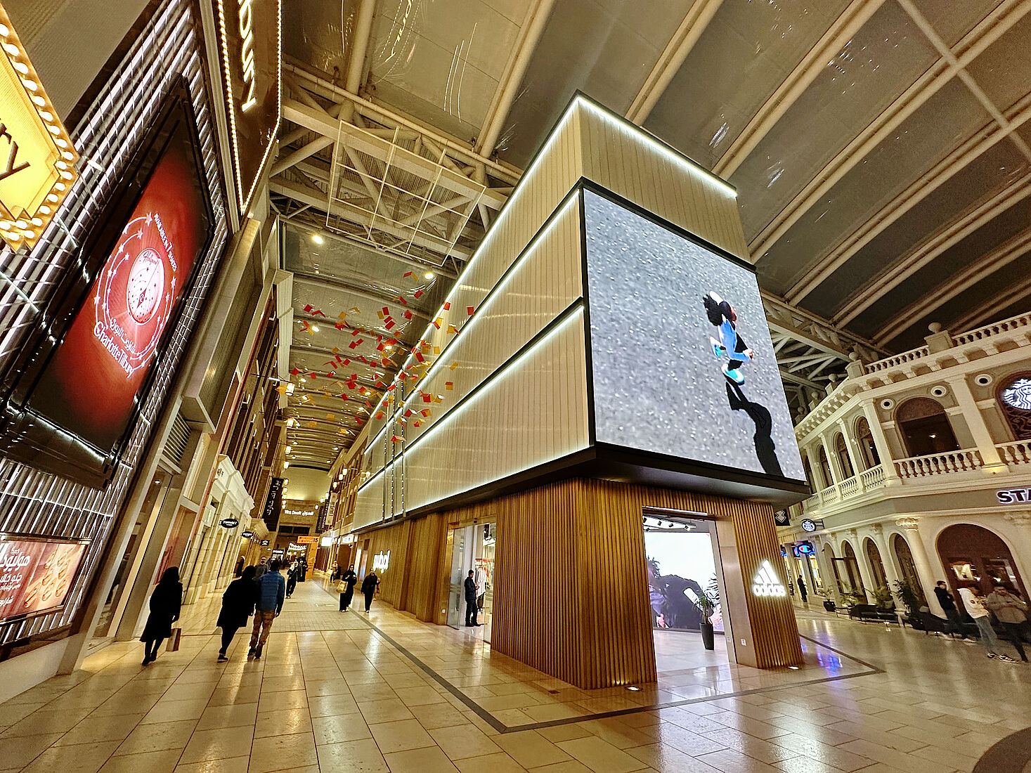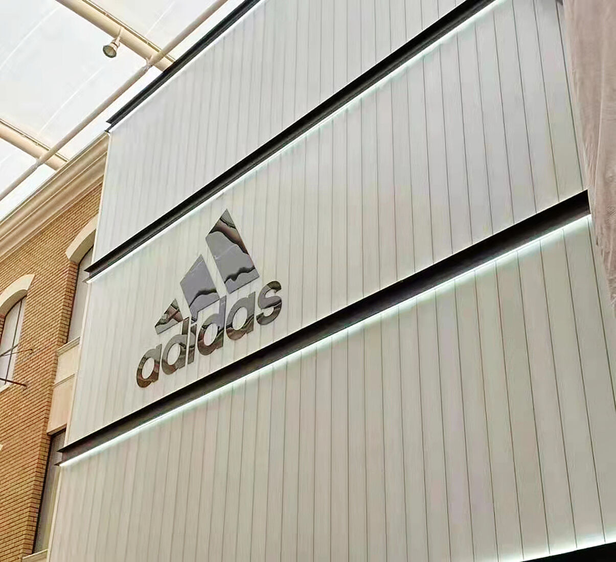 Im 1. Stock der Avenues Mall befindet sich ein besonders auffälliges Geschäft: der adidas-Store. Die Sportmarke hat hier eine weitläufige und stylische Filiale eingerichtet. Der Store ist von einer imposanten Glasfassade umgeben, die aus drei übereinanderliegenden Profilbauglaswänden besteht und stilvoll die bekannten adidas-Streifen widerspiegelt. Durch dezente Beleuchtung erstrahlen diese Wände in einer edlen, modernen Atmosphäre.