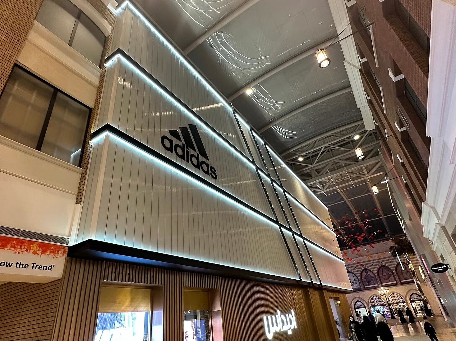 Auf beiden Längsseiten verlaufen schwarze Schrägstreifen, die durch gezielte Lichtakzente hervorgehoben werden und das Logo subtil ergänzen. Auf einer der Glaswände prangt das ikonische adidas-Logo, während auf der gegenüberliegenden Seite der Markenname in arabischer Schrift zu sehen ist.