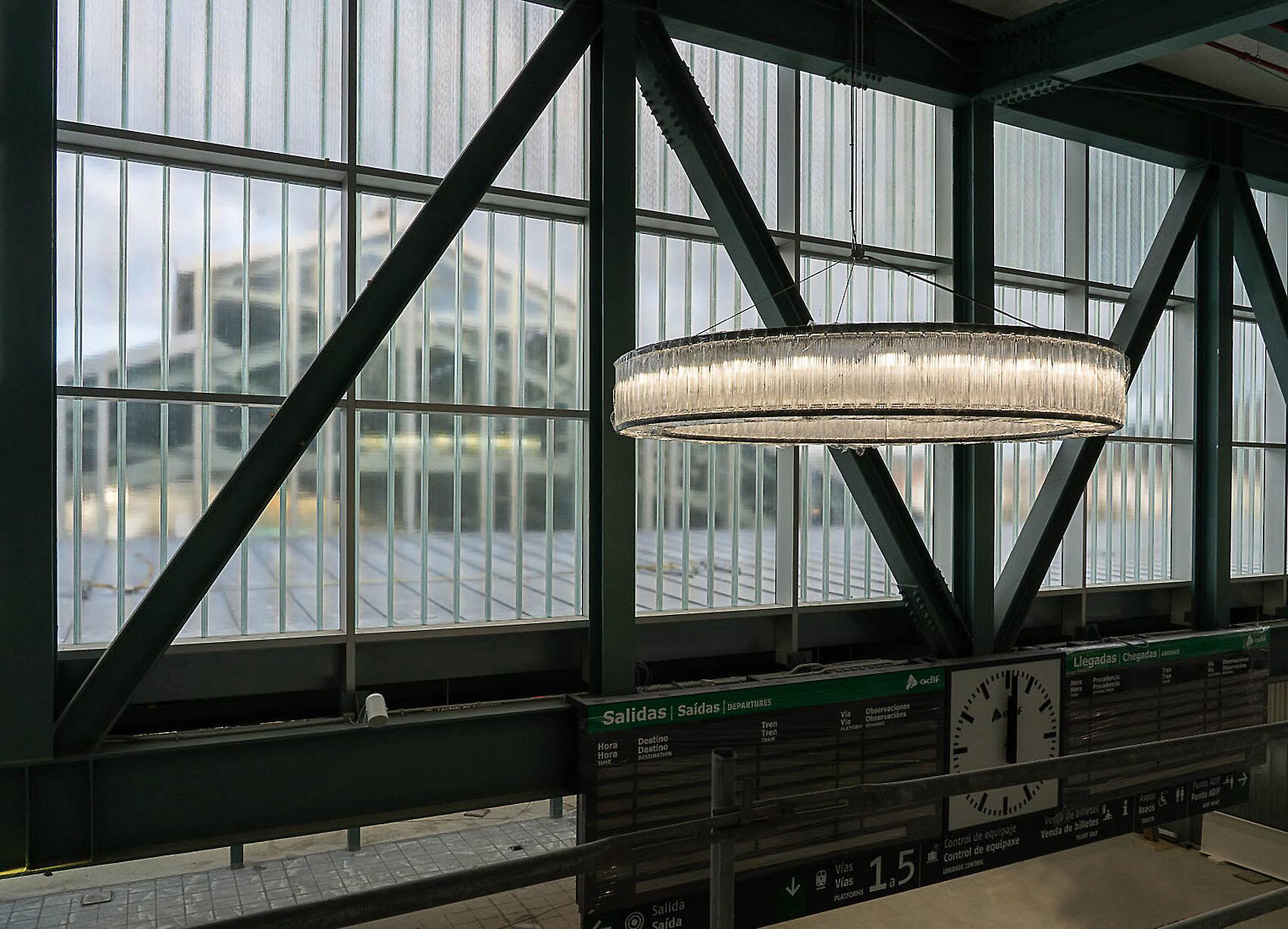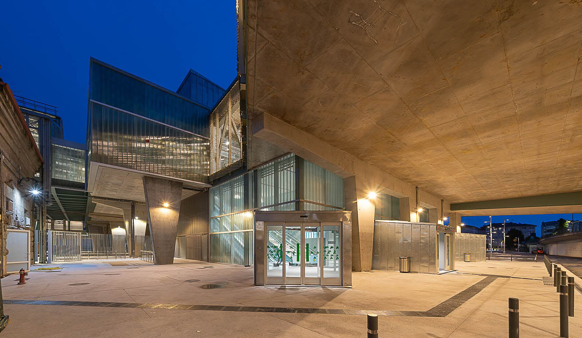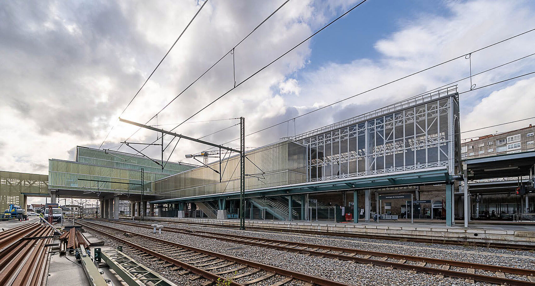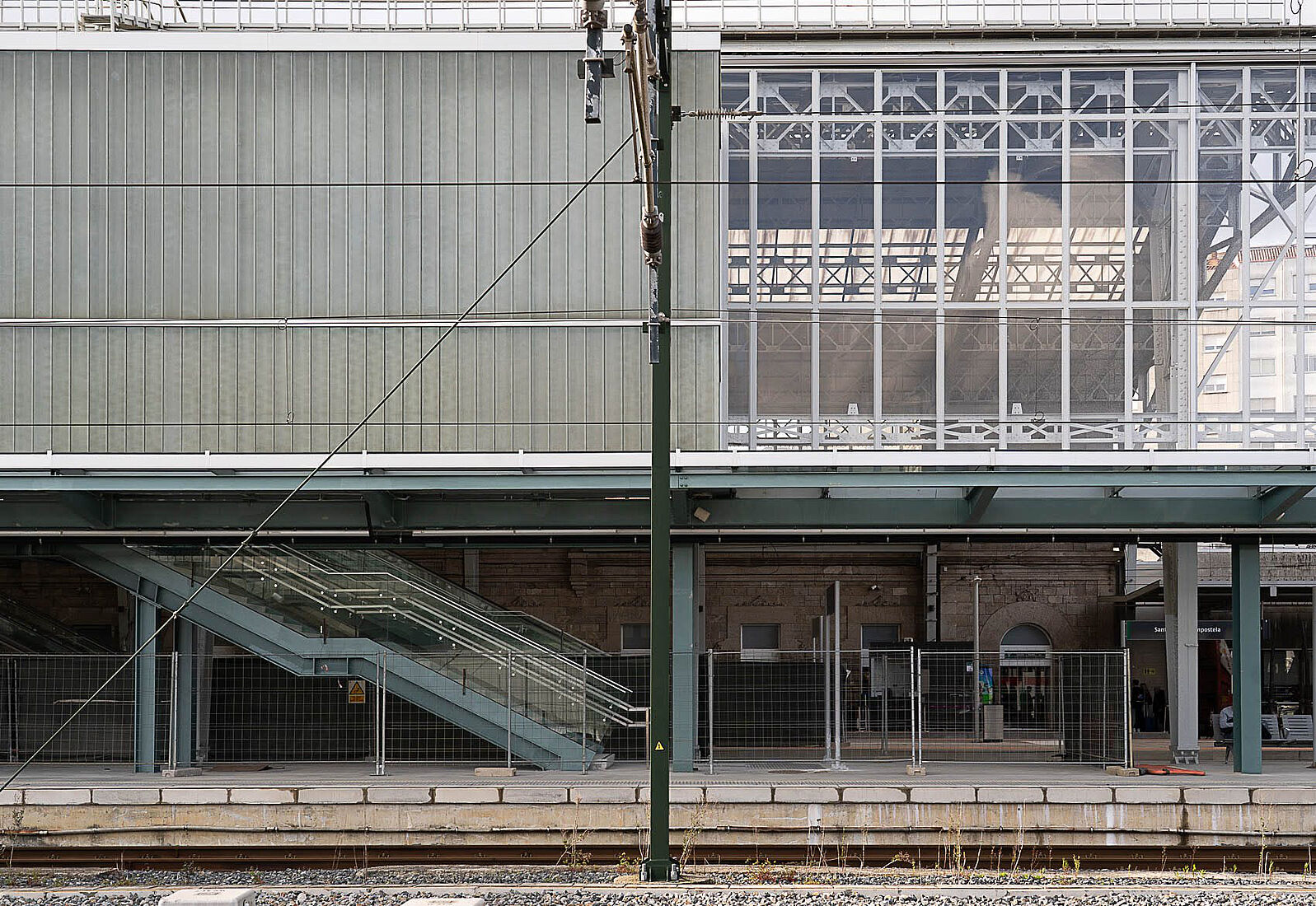 Das neue Passagiergebäude wurde über den Gleisen errichtet und ruht auf den bestehenden Bahnsteigen. Die Stahlstruktur wurde in einer aufwendigen Aktion mit einem 600-Tonnen-Kran montiert. Mit einer Fläche von rund 5.300 Quadratmetern auf fünf Ebenen folgt das Gebäude einem funktionalen und effizienten Design und fügt sich in die bestehende Infrastruktur ein. Die Hauptlobby öffnet sich zu einem neuen, über 1.500 m² großen Bahnhofsvorplatz, der das unebene Gelände überwindet und eine direkte Anbindung an die Rúa Hórreo schafft.
