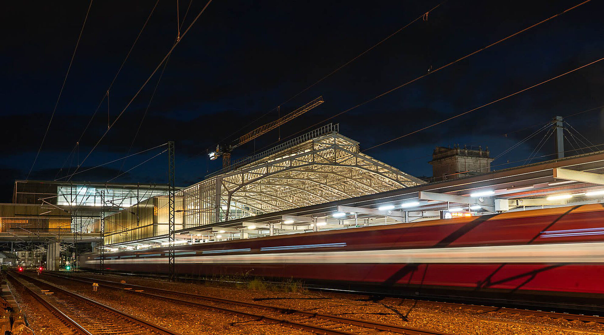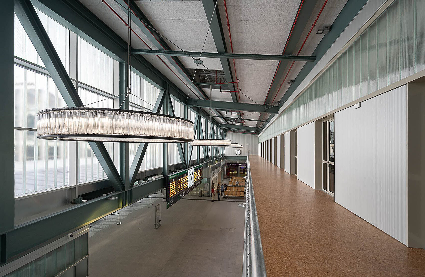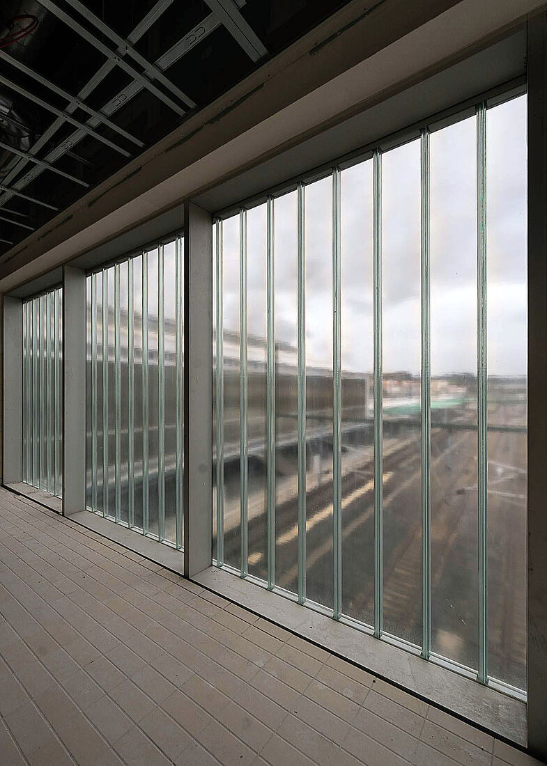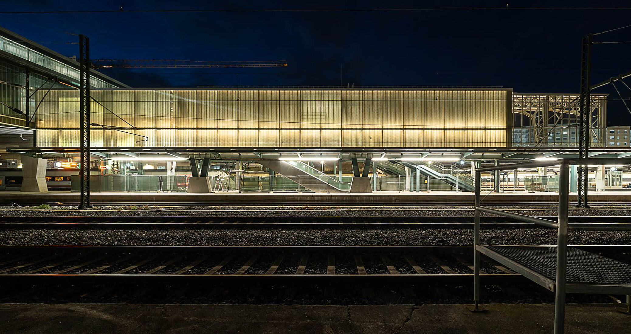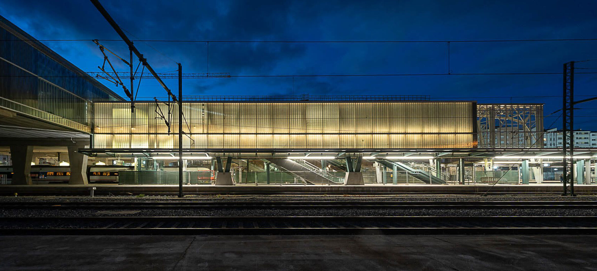 Das neue Passagiergebäude wurde über den Gleisen errichtet und ruht auf den bestehenden Bahnsteigen. Die Stahlstruktur wurde in einer aufwendigen Aktion mit einem 600-Tonnen-Kran montiert. Mit einer Fläche von rund 5.300 Quadratmetern auf fünf Ebenen folgt das Gebäude einem funktionalen und effizienten Design und fügt sich in die bestehende Infrastruktur ein. Die Hauptlobby öffnet sich zu einem neuen, über 1.500 m² großen Bahnhofsvorplatz, der das unebene Gelände überwindet und eine direkte Anbindung an die Rúa Hórreo schafft.